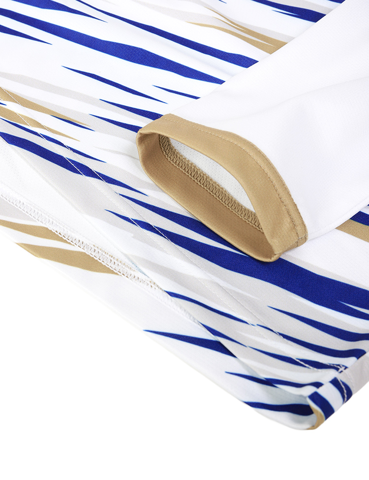 合わせて、シャツの袖形状を昨年までのラグランスリーブからセットインスリーブに変更し、ストライプが入る面積を拡大。よりシャープな印象に仕上げました。さらに襟にはジャガード編みでストライプを表現。異なる素材による横向きのラインを入れることで、着用したときにやわらかな印象を演出します。